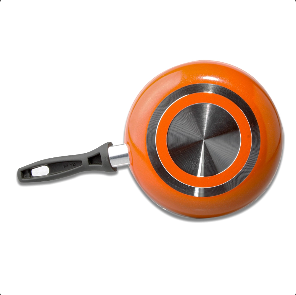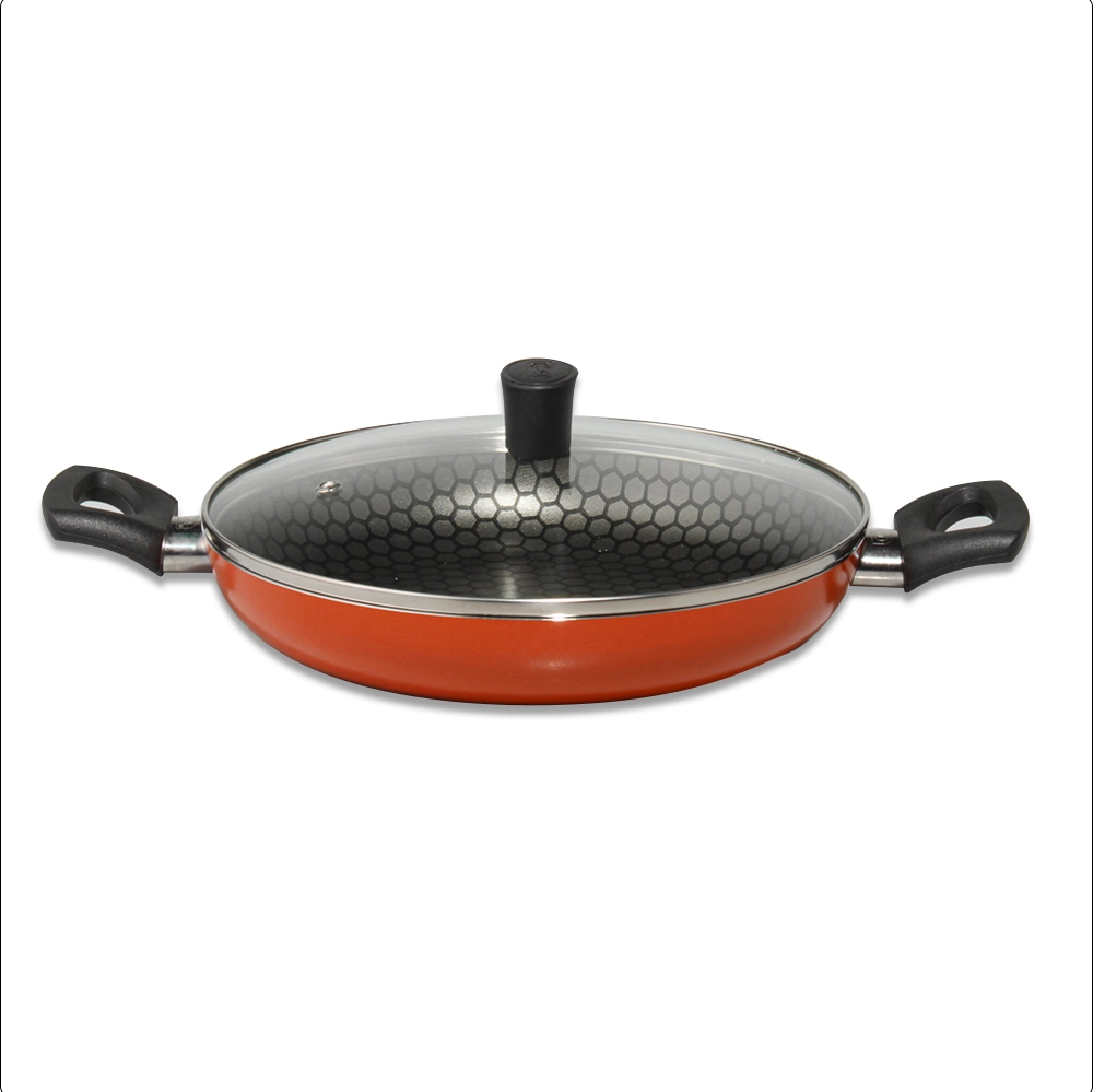 Su diseño interior en color negro con patrón de hexágonos y su acabado exterior en tono naranja brillante aportan un estilo moderno y llamativo a cualquier cocina. Las tapas de vidrio templado permiten visualizar los alimentos mientras se cocinan, y los mangos ergonómicos aseguran un agarre cómodo y seguro.