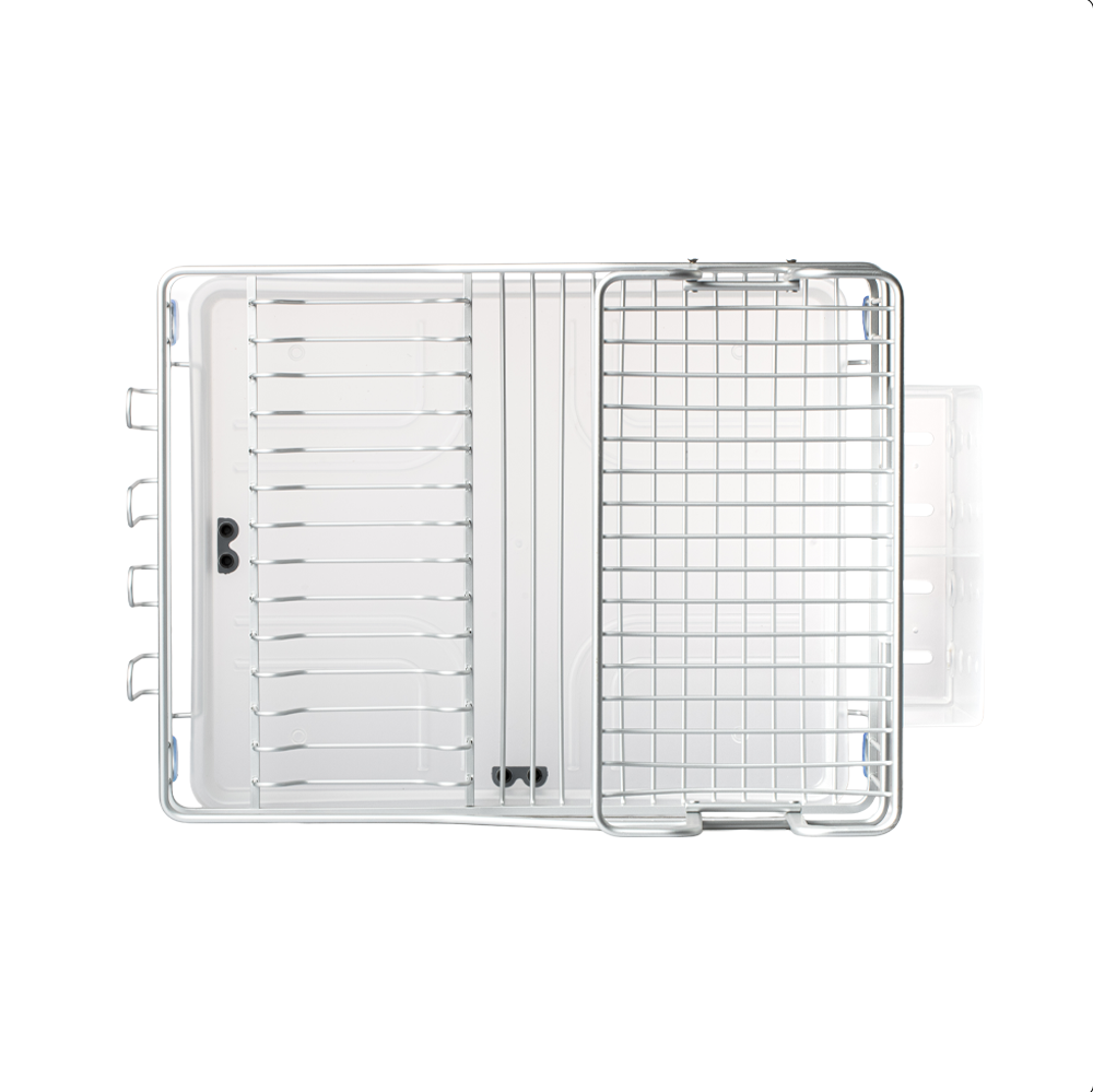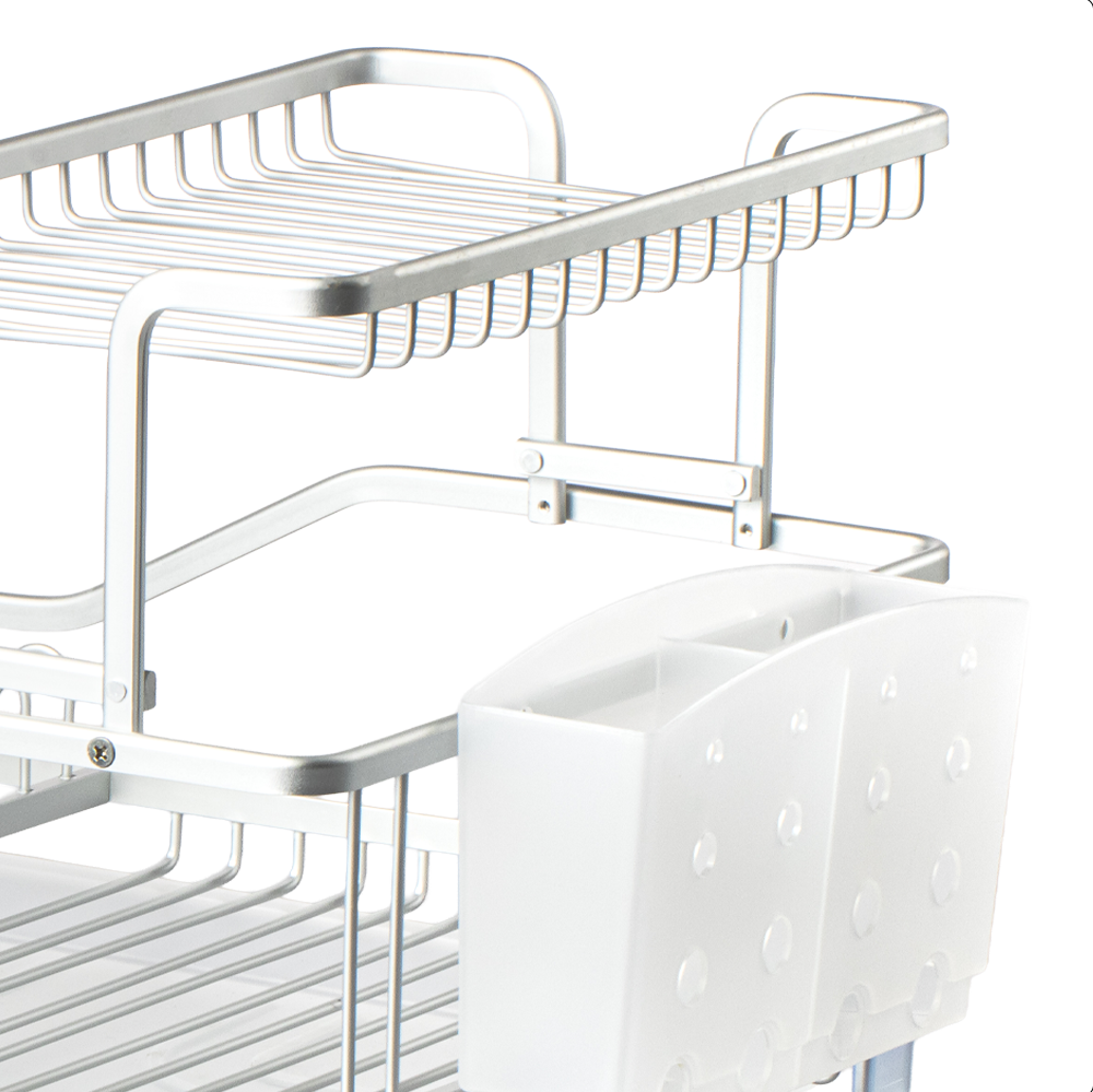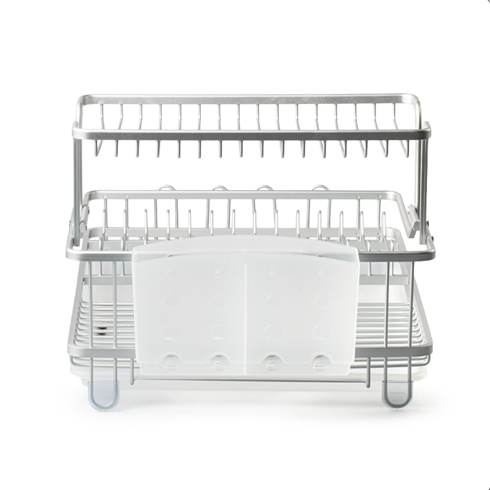 El Escurridor Doble Nivel Aluminio Nuvó incluye una charola plástica que recoge el exceso de agua, evitando que se derrame sobre la superficie y manteniendo siempre tu cocina limpia y ordenada. También cuenta con un práctico porta cubiertos de plástico, ideal para mantener cucharas, cuchillos y tenedores organizados y separados de los platos y vasos.