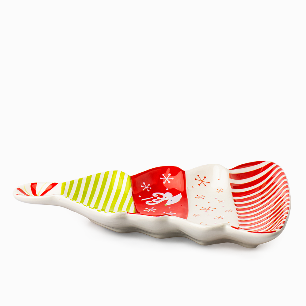 Con medidas de 22cm de largo, 18cm de ancho y 3cm de alto, el Plato Árbol Navideño 22cm Dolomita Love And Lemons destaca por los detalles en cada nivel del árbol. La base presenta un diseño de líneas rojas y blancas, evocando los bastones de caramelo tradicionales. El siguiente nivel muestra un fondo blanco con copos de nieve delicadamente distribuidos. Más arriba, un nivel en color rojo incluye dos renos enfrentados, aportando un toque festivo y encantador. Luego, se encuentran líneas verdes y blancas que representan la frescura del árbol navideño, y finalmente, en la punta, un círculo en forma de caramelo cierra con un detalle dulce y lleno de color.