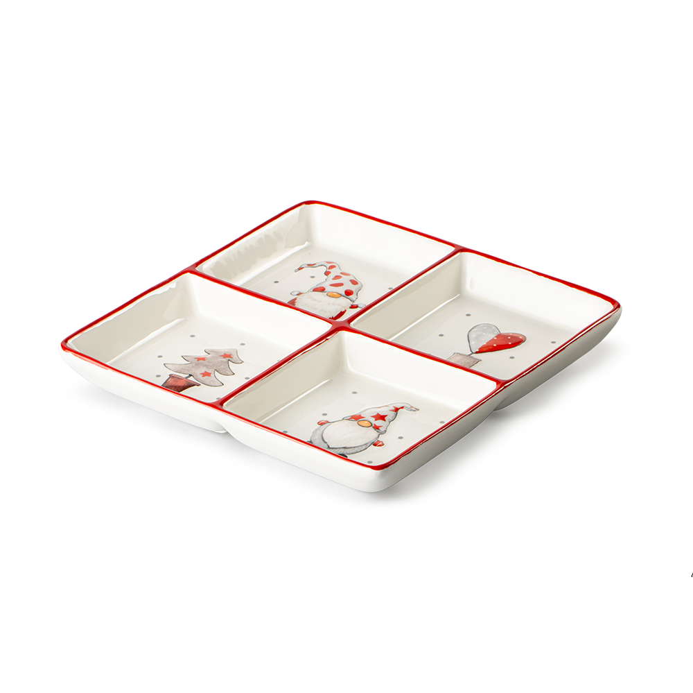 El Plato Dulcero Gnomo Cerámica Top Choice tiene medidas ideales de 20 cm de largo y ancho, perfecto para cualquier mesa. Su característica más funcional son las cuatro divisiones integradas. Por lo tanto, evitan que se mezclen los sabores de tus dulces o botanas. Es ideal para organizar gomitas, nueces o aperitivos salados.
