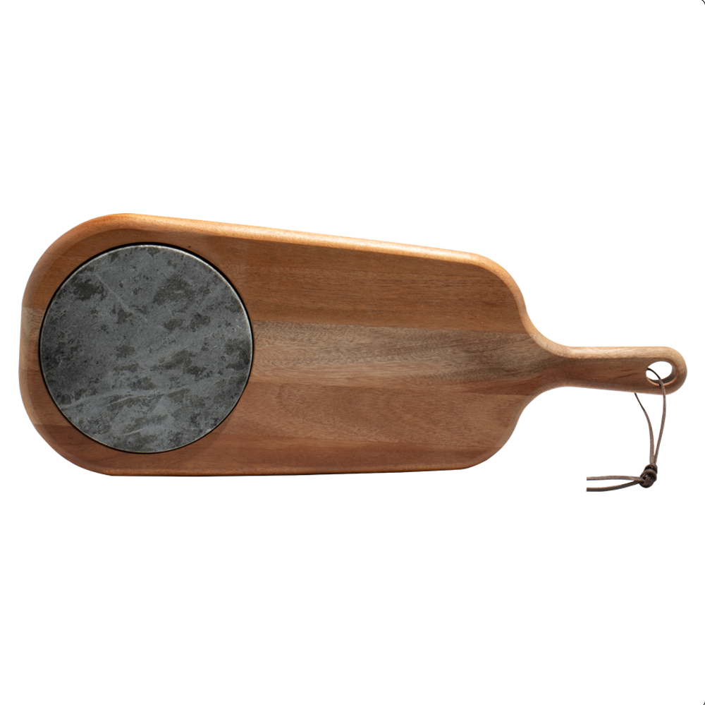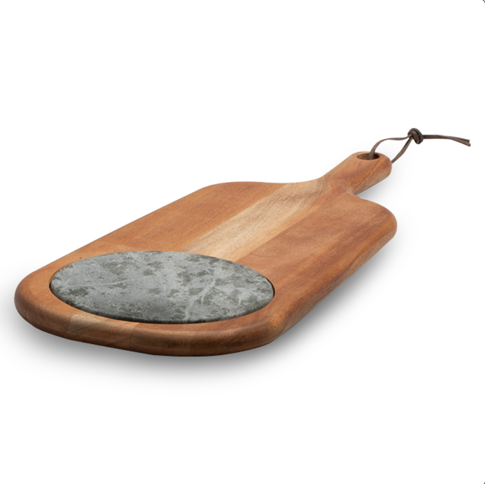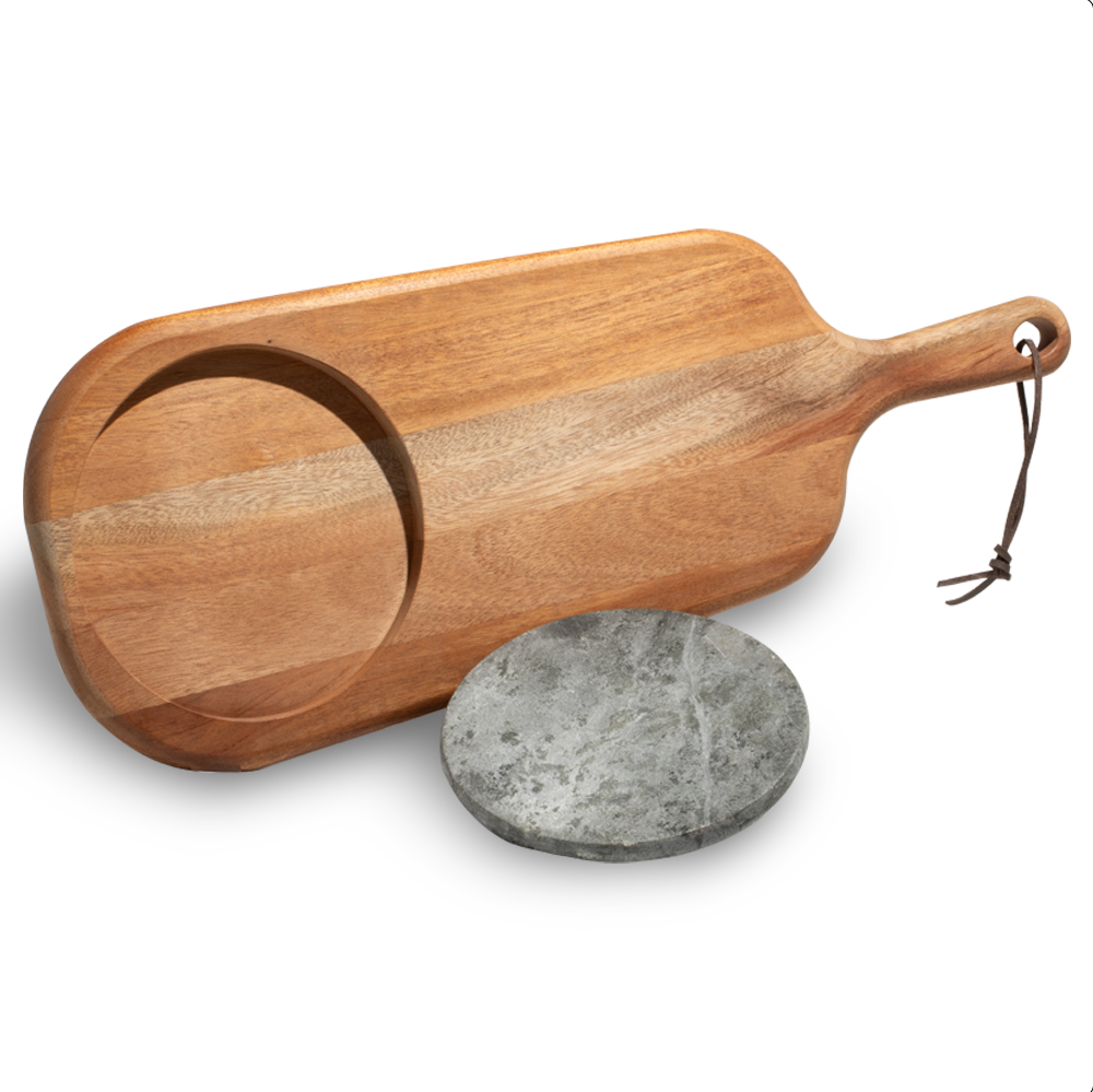 Disfrutar de quesos, embutidos o aperitivos nunca había sido tan sencillo. Gracias a su amplia superficie de 48×19 cm, tendrás el espacio suficiente para presentar una gran variedad de alimentos de manera organizada y atractiva. Además, incluye una piedra redonda desmontable, perfecta para mantener los quesos a la temperatura adecuada o para cortar de forma práctica sin dañar la superficie de la madera.