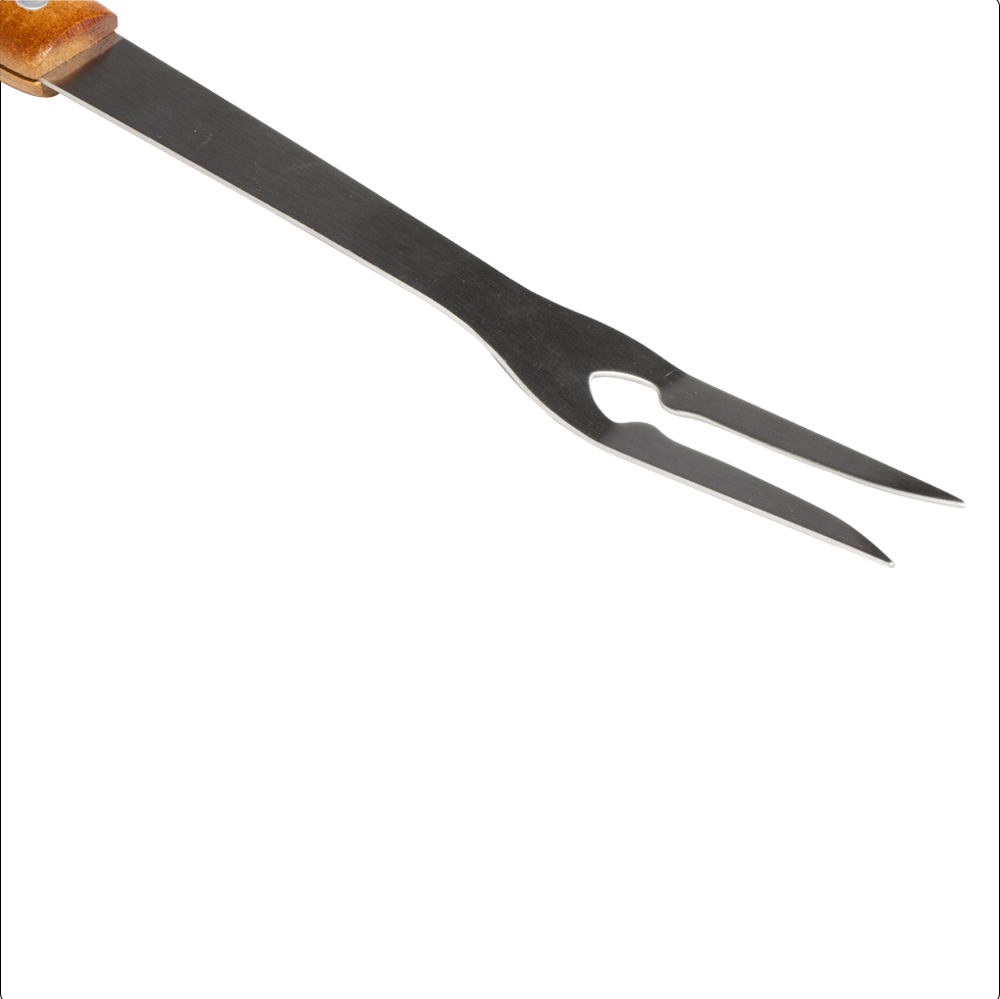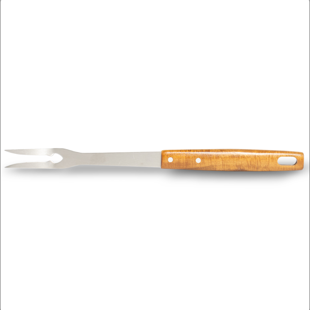 Además, el mango de madera natural mide 20 cm y aporta un toque elegante y tradicional. Su forma ergonómica asegura un agarre firme y cómodo, reduciendo la fatiga incluso en largas sesiones de asado. Gracias a su longitud total de 42 cm, podrás trabajar manteniendo una distancia segura del fuego o de superficies calientes.