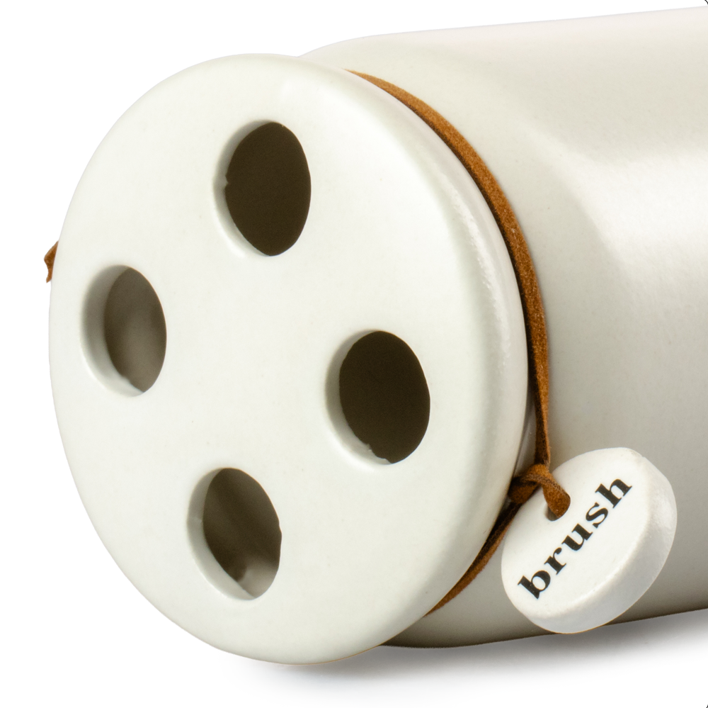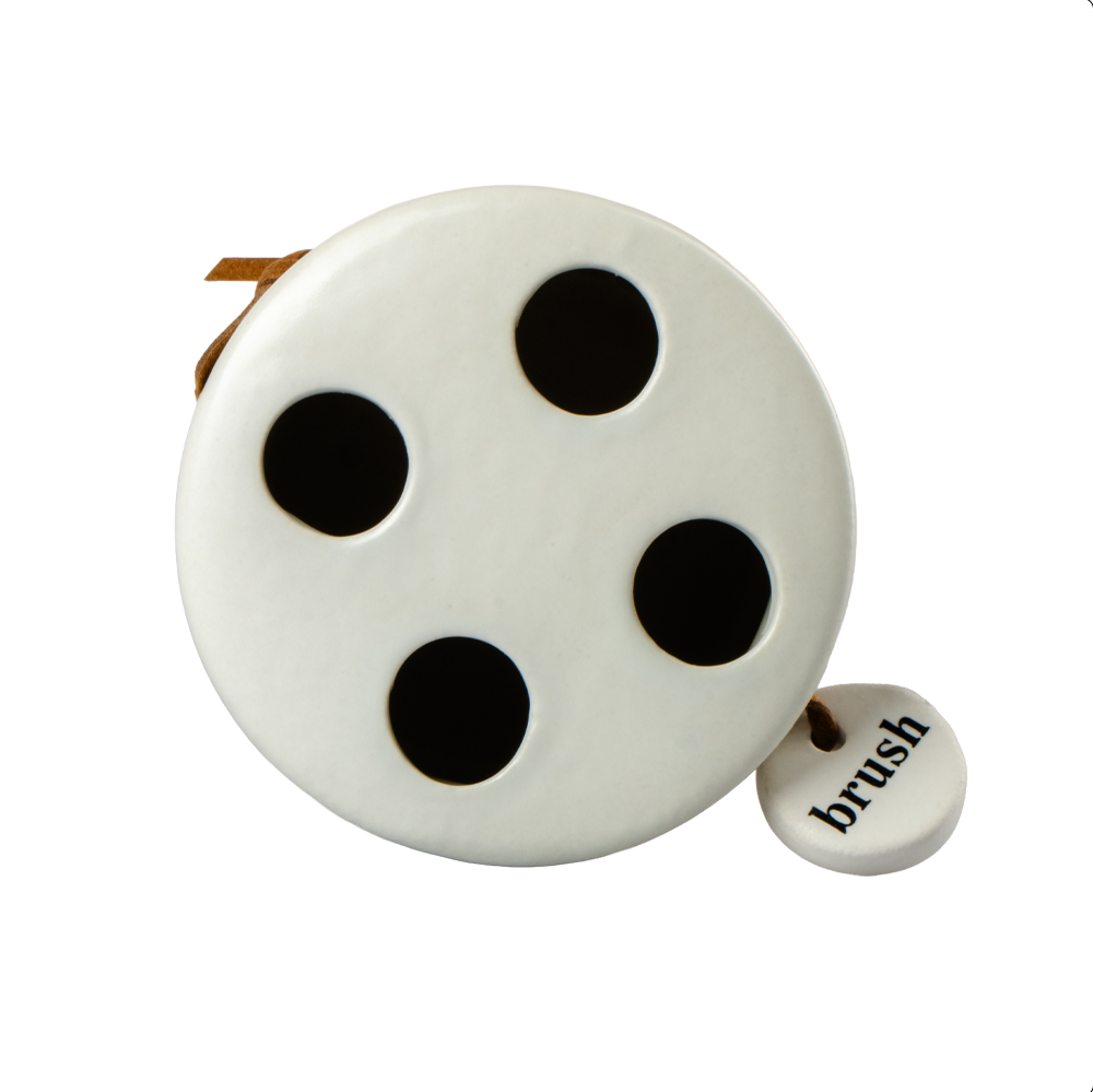 Un detalle que lo hace único es su cinta con una placa de cerámica que lleva grabada la palabra “brush”. Aportando un toque distintivo y moderno que no solo resalta en tu baño, sino que también lo convierte en un accesorio decorativo.